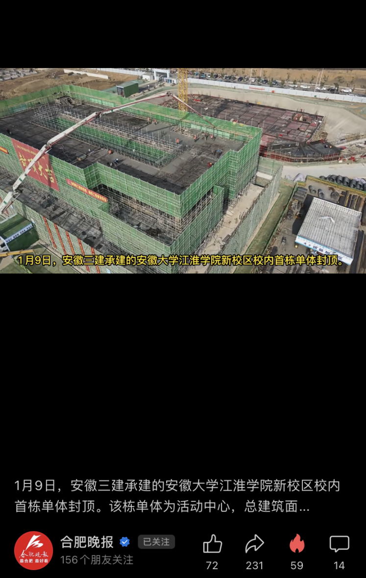 媒體聚焦丨合肥晚報(bào)視頻號(hào)、江淮晨報(bào)報(bào)道公司承建的安徽大學(xué)江淮學(xué)院新校區(qū)項(xiàng)目最新進(jìn)展