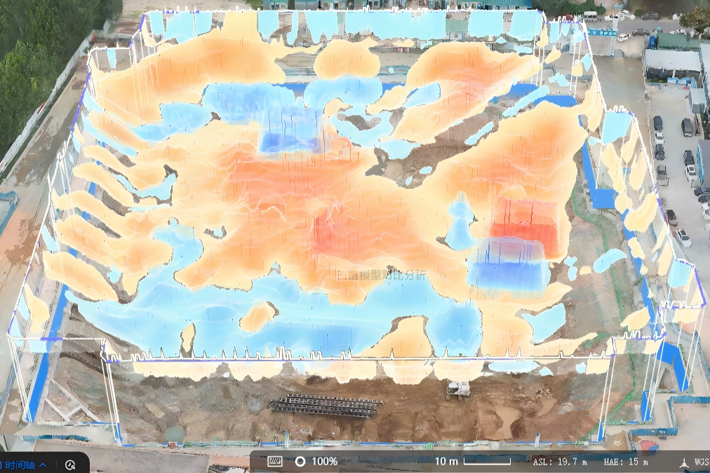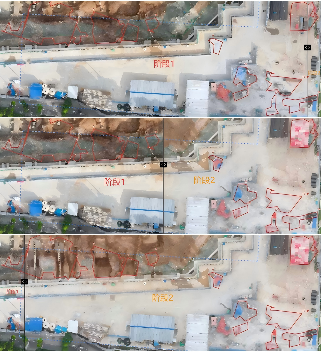通過(guò)空間模型與時(shí)間軸結(jié)合,系統(tǒng)對(duì)多時(shí)間點(diǎn)二維、三維及斷面模型數(shù)據(jù)自動(dòng)比對(duì),直觀呈現(xiàn)土方開(kāi)挖變化與工程進(jìn)度,為進(jìn)度計(jì)劃制定和優(yōu)化提供支撐。同時(shí),AI圖像比對(duì)技術(shù)可自動(dòng)識(shí)別不同時(shí)間點(diǎn)模型間的差異區(qū)域,實(shí)現(xiàn)施工區(qū)域動(dòng)態(tài)變化精準(zhǔn)監(jiān)控。