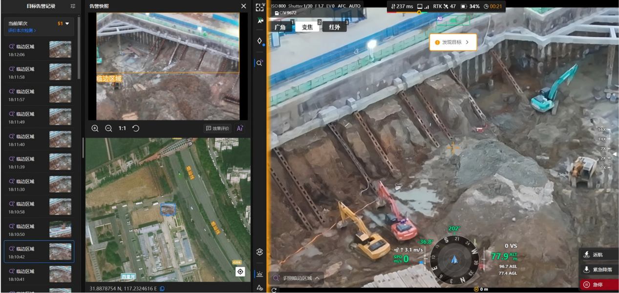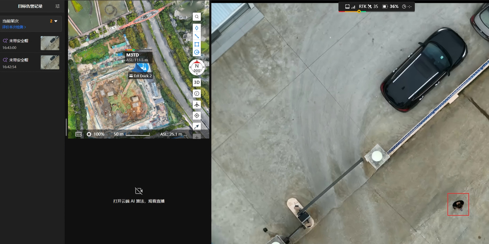 該項(xiàng)目部署具備定時(shí)自主飛行與實(shí)時(shí)傳輸能力的無(wú)人機(jī)機(jī)場(chǎng)系統(tǒng),結(jié)合AI算法引擎實(shí)現(xiàn)施工現(xiàn)場(chǎng)精度還原與目標(biāo)智能感知。在安全管理方面,無(wú)人機(jī)按預(yù)設(shè)航線(xiàn)自動(dòng)巡檢或遠(yuǎn)程操控,實(shí)時(shí)回傳畫(huà)面,AI大模型視覺(jué)算法可自動(dòng)識(shí)別未帶安全帽、臨邊區(qū)域等隱患,觸發(fā)告警并記錄目標(biāo)信息,助力管理人員快速排查處置,擴(kuò)大巡查范圍、縮短隱患處置時(shí)間,提升安全管理效率。